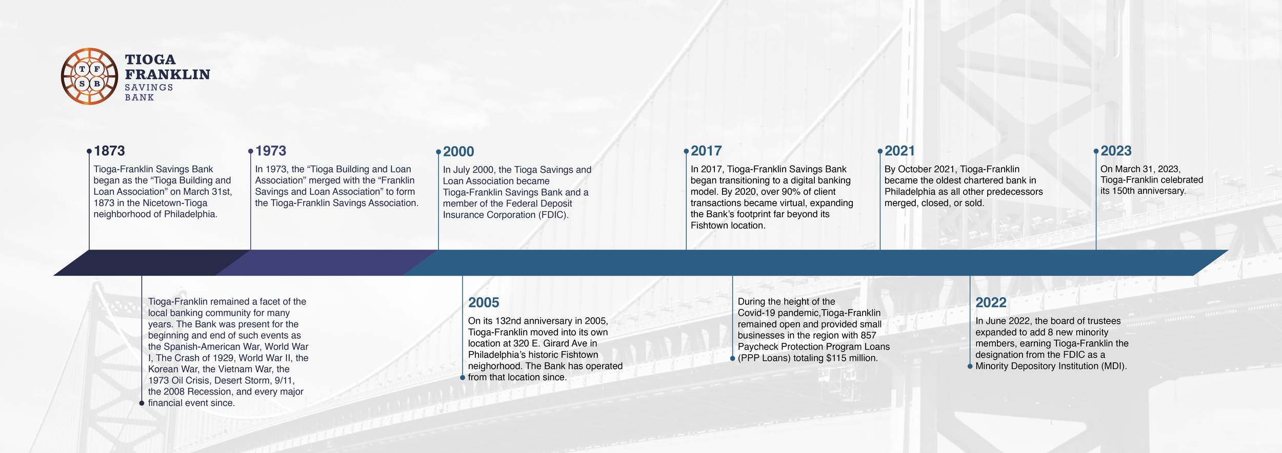 To promote Tioga-Franklin Savings Bank and its 150th anniversary, I created a timeline graphic of their major historical events for social media, website, and print.